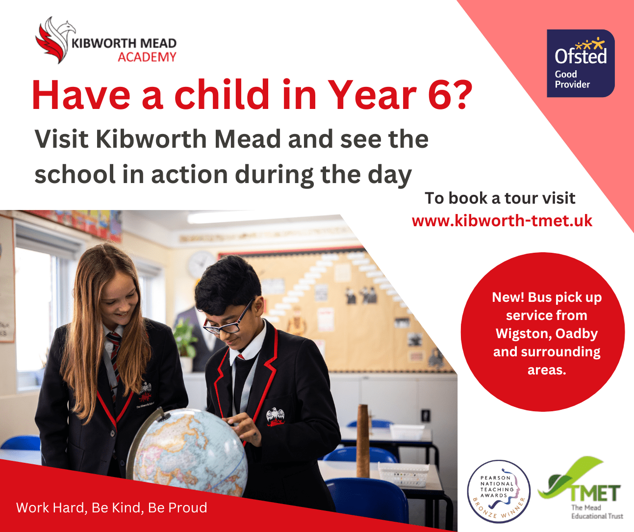 Kibworth Mead Academy shares the ethos, vision and values of TMET which is for each and every member of the school community to Make A Positive Difference. To achieve this vision our school has three core values, which underpin every aspect of life at Kibworth, Work Hard, Be Kind and Be Proud.