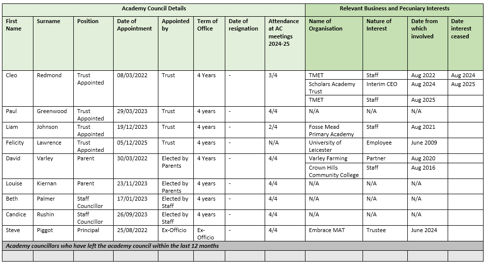 The Academy Council holds the Principal and school senior leadership team to account for the educational performance of the school and its pupils.
