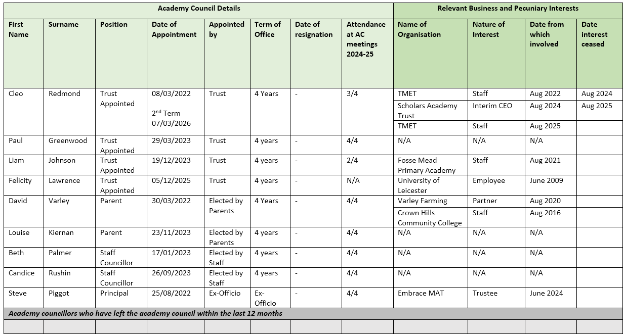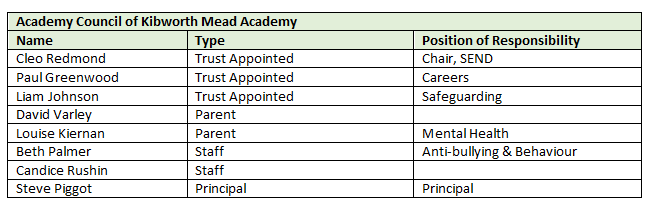 The Academy Council holds the Principal and school senior leadership team to account for the educational performance of the school and its pupils.